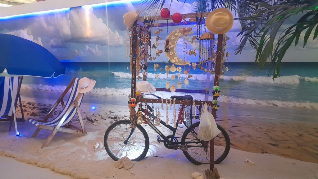 En la entrada de la instalación perteneciente al Fondo Cubano de Bienes Culturales (FCBC), organizador del evento, una sugerente ambientación hace referencia a hitos de la urbe yumurina, el polo turístico de Varadero y el reciclaje de recursos de la naturaleza.