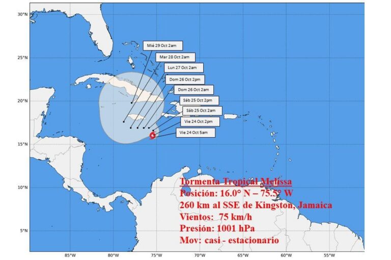 Durante las últimas horas la tormenta tropical Melissa ha mostrado poco cambio sobre aguas del mar Caribe, moviéndose lentamente al norte-noroeste, con ligeras fluctuaciones en su velocidad de traslación, que ahora es de 4 kilómetros por hora.