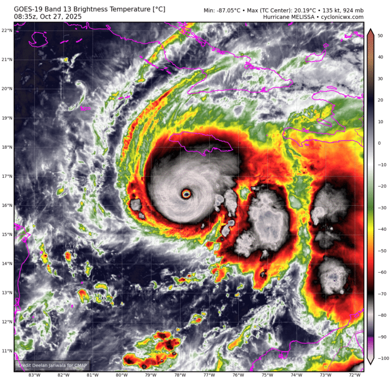 Según el Aviso de Ciclón Tropical No. 9, los vientos máximos sostenidos de Melissa alcanzan los 110 kilómetros por hora, con rachas superiores, y su presión central mínima descendió a 986 hectoPascal.
